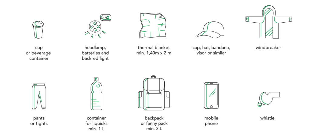 - Each runner must carry all mandatory equipment throughout the race (see article 9 EQUIPMENT). At any time, commissioners may request a check of this equipment. All runners are obliged to submit to such requests, under penalty of elimination from the race.