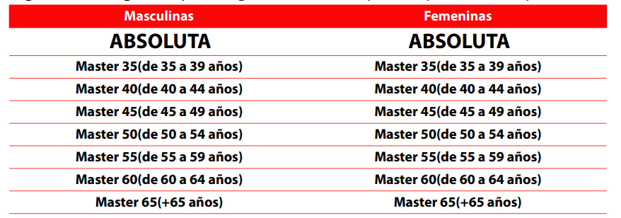 Se establecen las siguientes categorías, que se rigen desde el día que cumplen la edad que define cada categoría.
