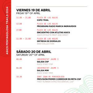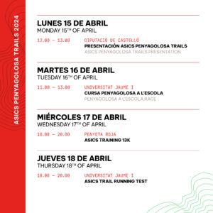 Recordamos el programa de actos de la semana. El martes a las 11 horas, se celebrará la cursa Penyagolosa a l’Escola, una carrera para los más pequeños en la Universidad Jaume I. El miércoles a las 18.00 horas se llevará a cabo el ASICS Training saliendo desde las pistas de Penyeta Roja en un recorrido de montaña de 13 kilometros. El jueves, a las 18:00 horas tendrá lugar el Test de Producto de ASICS en las pistas de atletismo de la Universitat Jaume I. El viernes, de 11 a 21 horas, tendrá lugar la Feria del Corredor y recogida de dorsales en la Plaza de las Aulas de Castellón.