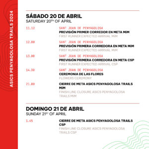 La madrugada del viernes al sábado, a las 00:00h. arrancará la CSP desde la Universitat Jaume I. Seis horas más tarde, comenzará la MiM desde el mismo lugar. Una vez que lleguen a meta los primeros clasificados, se realizará la Ceremonia de las Flores en Sant Joan. La carrera se podrá seguir en directo a partir de las 8:00h hasta las 14:00h a través de www.evasiontv.es y penyagolosatrails.com.