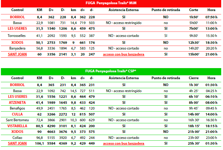 - XIV FUGA Penyagolosa Trails® CSP® [Castelló-Penyagolosa]: 106K 5600d+ 4400d- 18/04/2025. Tiempo máximo: 25 h. 30’. 5 puntos ITRA. UTMB 100K Qualifier. 2027 Western States Endurance Run Qualifer.